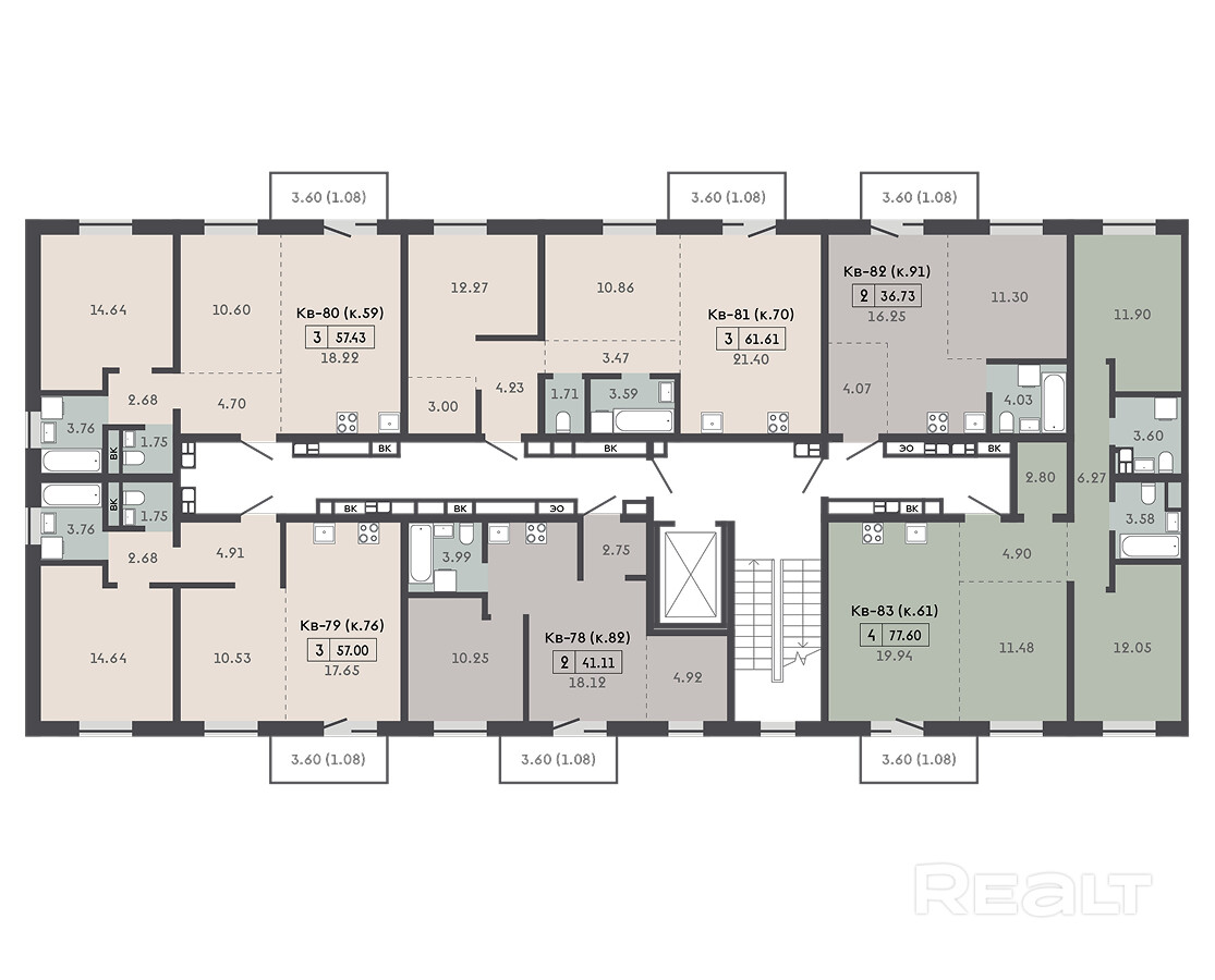 Проект включает три подъезда разной этажности (6, 7 и 8 этажей), в которых представлено 104 квартиры различных планировок — от компактных евродвушек до просторных пятикомнатных квартир площадью до 153,1 квадратного метра. Особое внимание уделено качеству внутреннего пространства: каждая квартира обладает просторной мастерской спальней, отдельными гардеробными зонами и большими открытыми балконами, создающими ощущение расширения жилого пространства.