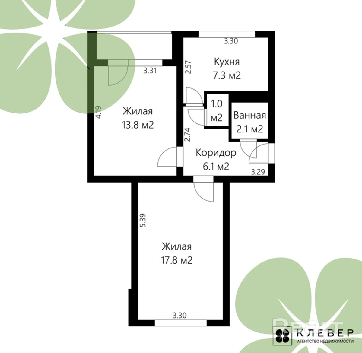 Квартира расположена на комфортном 3-м этаже 5-этажного дома. Тип дома – панельный (блок-комната). Расположение комнат – на две стороны, площадь комнат 17.8 м2 и 13.8 м2, площадь кухни 7.3 м2, раздельный санузел.