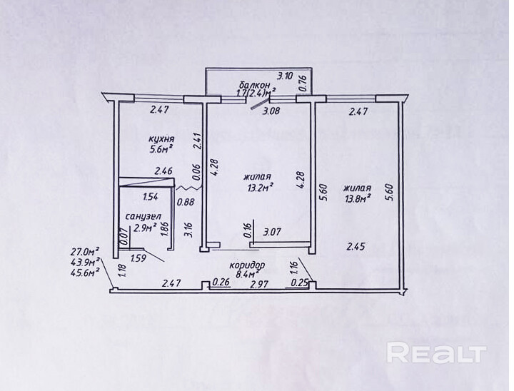 - Квартира находится на 4-ом этаже. Площадь квартиры: общая 43,9 м2,  по СНБ 45,2 м2, две изолированные  жилые комнаты.