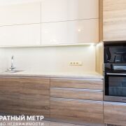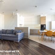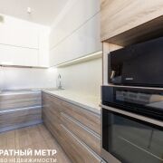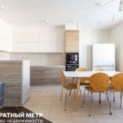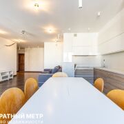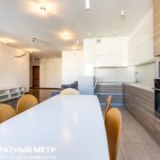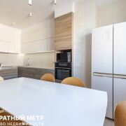 Кухня-гостиная с прилегающей барной стойкой оснащена посудомоечной машиной Bosch, индукционной плитой и духовым шкафом Gorenje, печью СВЧ, отдельно стоящим большим холодильником Side-by-side, и имеет огромное количество мест хранения. Керамогранит с подогревом, уложенный в мокрой зоне добавляет практичности, а стильный мягкий диван перед ТВ-зоной, и разные сценарии освещения еще более усиливают атмосферу покоя и уюта.