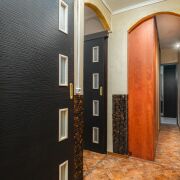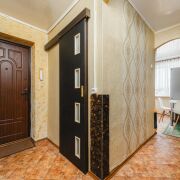 - В прихожей установлен вместительный шкаф-купе, который позволяет удобно организовать хранение вещей.