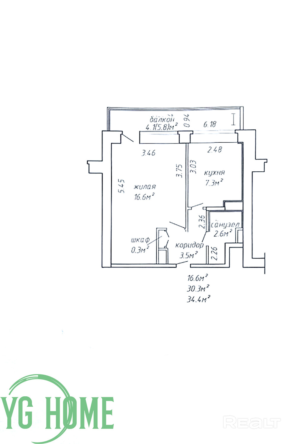 Площадь по СНБ - 34,4м2/общая-30,3м2/жилая-16.6м2/кухня-7.3м2