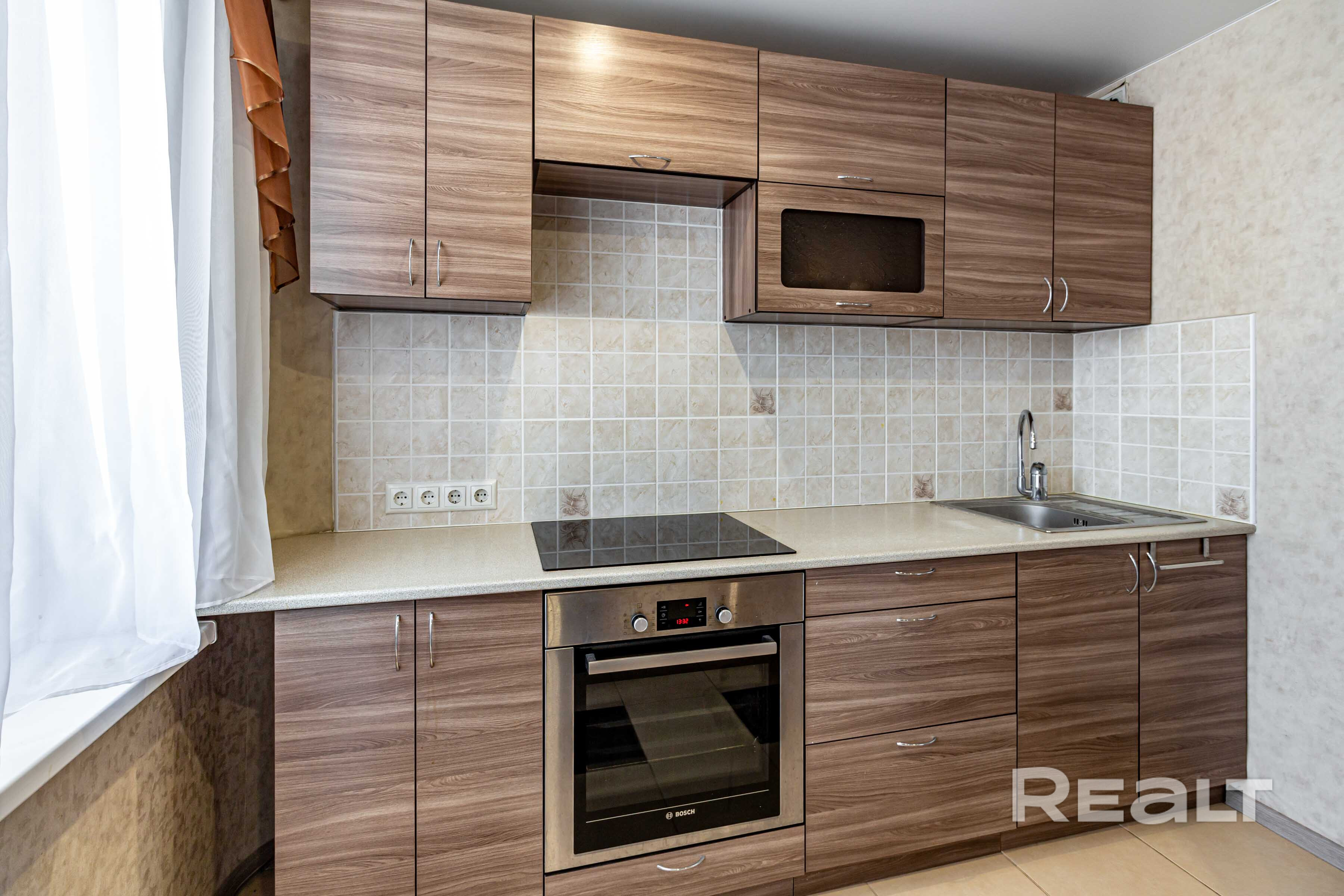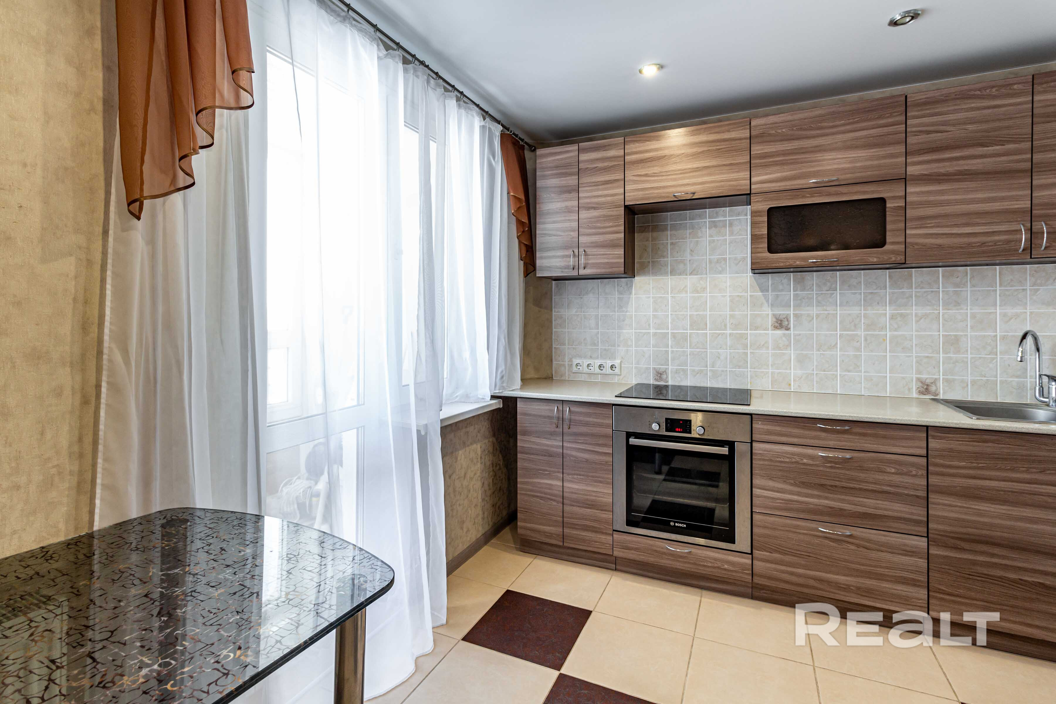 В квартире установлены качественные бытовые приборы: варочная панель и духовой шкаф Bosch, холодильник LG, стиральная машина Bosch. Сантехника – от известного бренда Grohe. Проточный нагреватель воды.