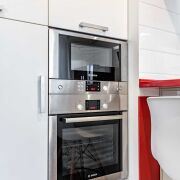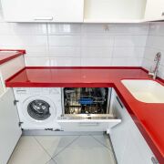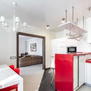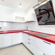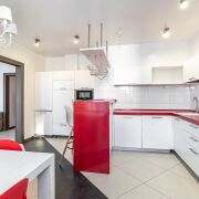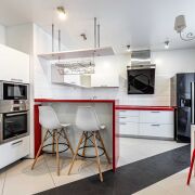- Кухня, достойная шеф-повара 👨🍳. Ярко-красная столешница будит лучше любого эспрессо ☕️, а полный комплект техники Bosch (включая холодильник side-by-side, который сам делает лед для ваших коктейлей 🍹) превращает рутину в удовольствие. Футуристичная вытяжка Elica позаботится, чтобы аромат вашего стейка не смешивался с вашими планами на вечер. 😉