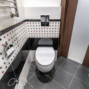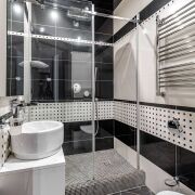 - Царство №2: Динамичный и стильный. 💪 Строгий черно-белый дизайн, просторная душевая кабина — идеальное место, чтобы зарядиться энергией перед покорением мира. 🚿