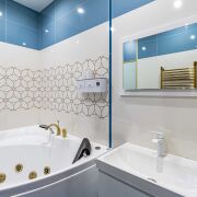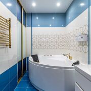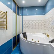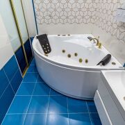 - Царство №1: Ваш личный SPA-салон. 👑 Угловая джакузи с гидромассажем. Золотистая фурнитура, чтобы почувствовать себя королевской особой. 🛀