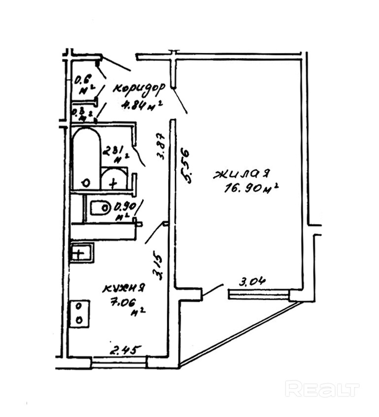 Удобная планировка: просторная комната 16,9м.кв. и отдельная кухня 7,06м.кв.