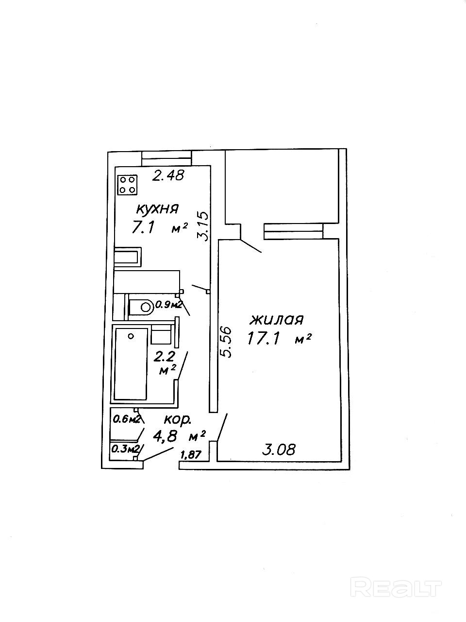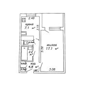 Общая площадь по СНБ — 34,8 м2 (жилая — 17,1 м2, кухня — 7,1 м2), высота потолков — 2,5 м.