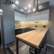 - Кухня меблирована и оборудована всей необходимой техникой: встроенным духовым шкафом, индукционной поверхностью, вытяжкой, СВЧ и холодильником. Здесь вы сможете готовить свои любимые блюда и радовать близких. Зона кухни расположена на подиуме (возвышении).