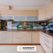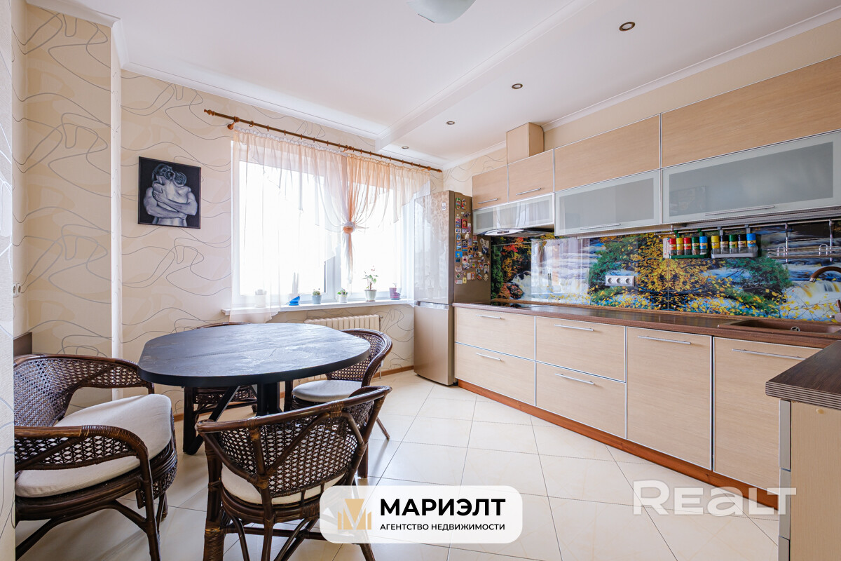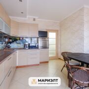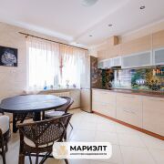 - Встроенная кухня с бытовой техникой: холодильник (Bosch), духовой шкаф, индукционная варочная поверхность, удобные шкафы с качественной фурнитурой, большой обеденный стол и стулья.