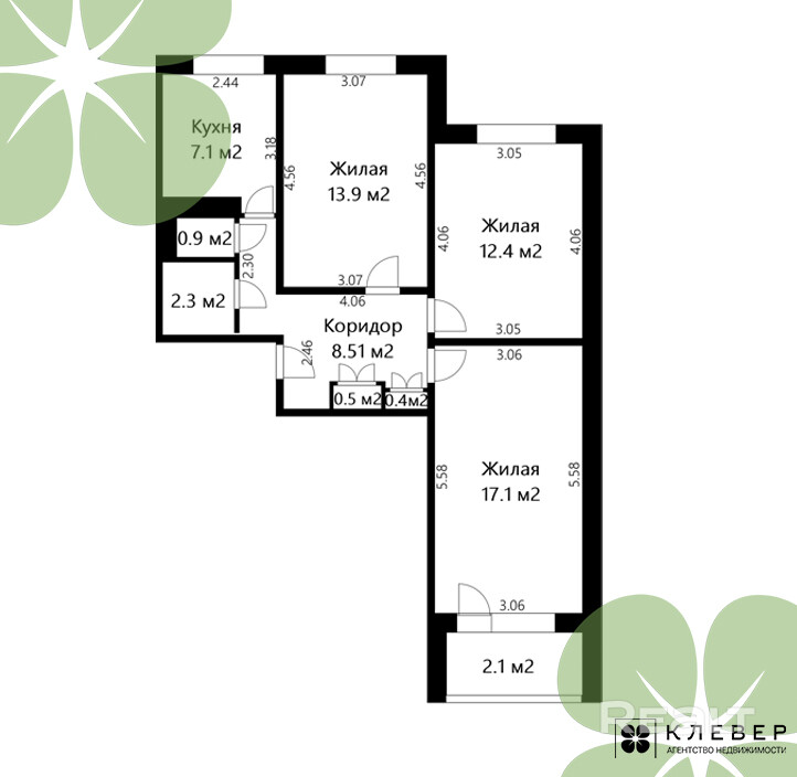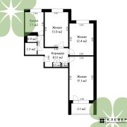 - Жилые комнаты: 17,1, 13,9 и 12,4 кв.м.