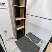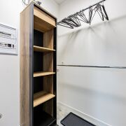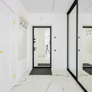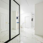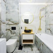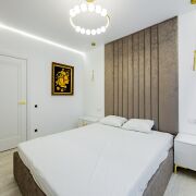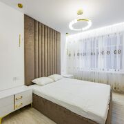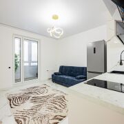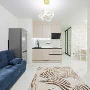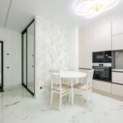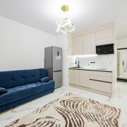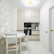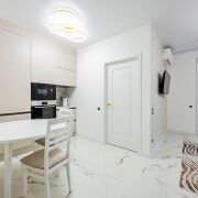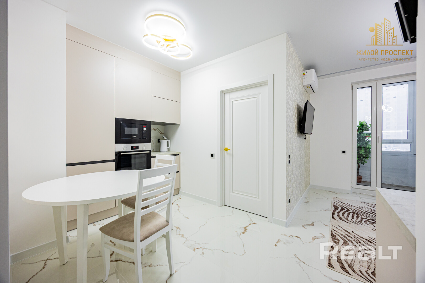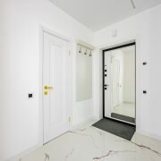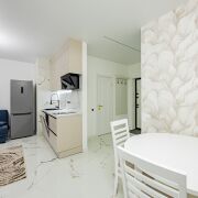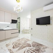 Квартира выполнена в светлой спокойной гамме с использованием качественных материалов. Кухня оформлена элегантными фасадами. В санузле установлена надежная сантехника и современное зеркало с подсветкой. При входе обустроена удобная гардеробная.