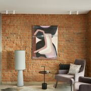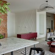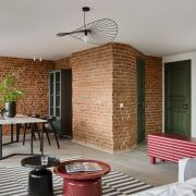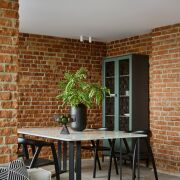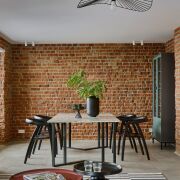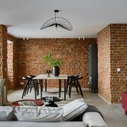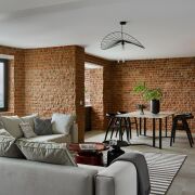 • Второй этаж оформлен в стиле лофт. Стены выложены натуральным красным кирпичом.
