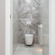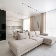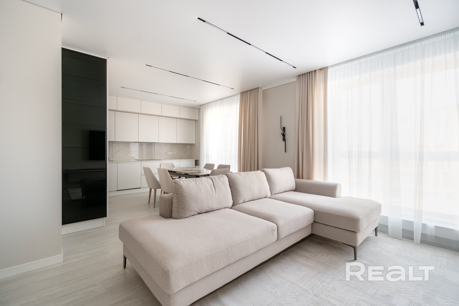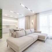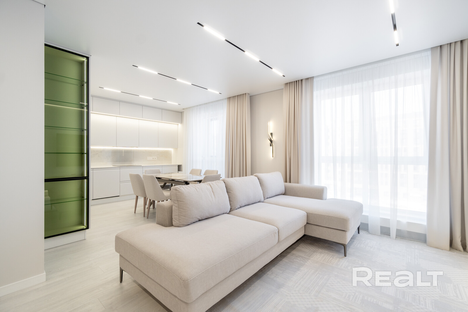Стены выровнены и подготовлены под покраску. В санузлах уложена кафельная плитка, в жилых комнатах — ламинат Quick-Step. Натяжные потолки со скрытым профилем, трековое освещение.