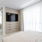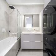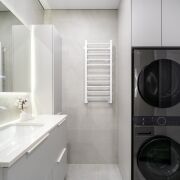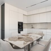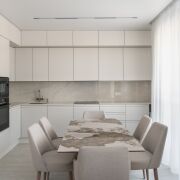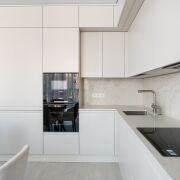Кухня и корпусная мебель выполнены на заказ, использована фурнитура Blum и качественные фасады. Установлена дорогая техника европейского производства, включая холодильник шириной 75 см и посудомоечную машину 60 см.