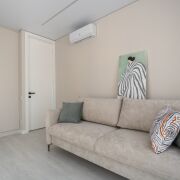 В квартире два внутренних блока кондиционеров с корректным отводом дренажа в канализацию. Установлен проточный водонагреватель с подачей горячей воды на кухню и в санузлы на время отключений. Смонтированы датчики протечки с автоматическим отключением воды.