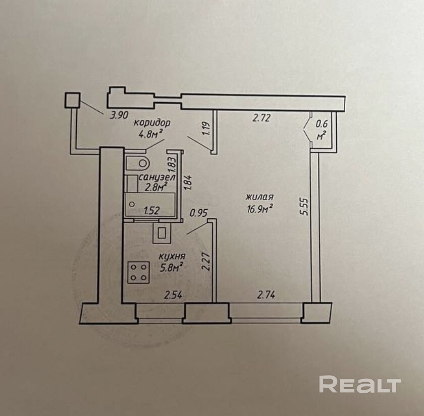 Общая площадь квартиры составляет 30.9 м2, жилая комната занимает 16.9 м2, площадь кухни — 5.8 м2. Квартира расположена на первом этаже четырехэтажного кирпичного дома, что обеспечивает отличную звукоизоляцию и комфортный микроклимат. Внутри выполнен свежий современный ремонт, после которого никто не проживал. Все готово для комфортного заселения или мгновенного запуска арендного бизнеса.