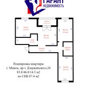 Доступна к покупке просторная и светлая 3-х комнатная квартира в каркасно-блочном доме в центре Минска около станции метро «Грушевка» по адресу пр-т Дзержинского, 26, площадью 87.4 кв.м. с тремя изолированными комнатами на две стороны, большой кухней 14.5 кв.м. и двумя санузлами.