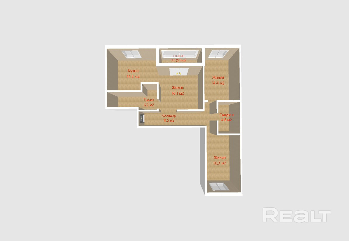 Квартира с удобной планировкой, комнаты имеют правильную форму. Площадь жилых комнат 16.3 кв.м., 16.1 кв.м., 14.4 кв.м.