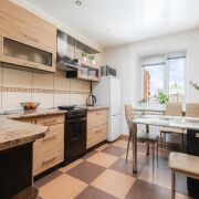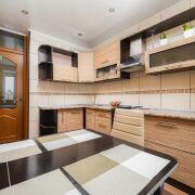 -В квартире выполнен аккуратный ремонт. Полы в коридоре и зале покрыты ламинатом, а на кухне плиткой, стены в зале и прихожей оклеены обоями, а на кухне рабочая зона отделана плиткой. Потолки в кухне пластиковые, в зале и прихожей окрашенные.