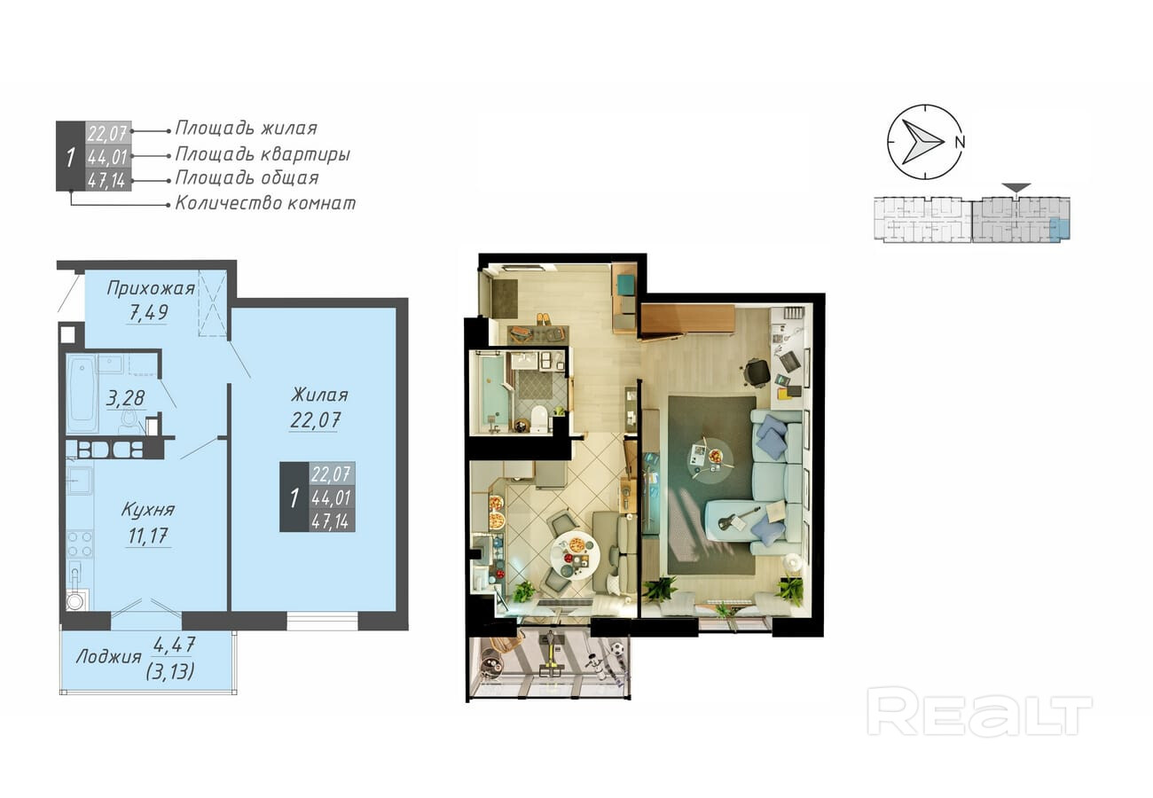 1-комнатные квартиры площадью 43 - 47 кв.м