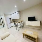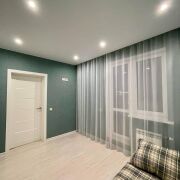 В квартире пространная кухня-гостиная светлая и уютная, с удобным раскладным диваном, зоной ТВ и комодом для хранения.
