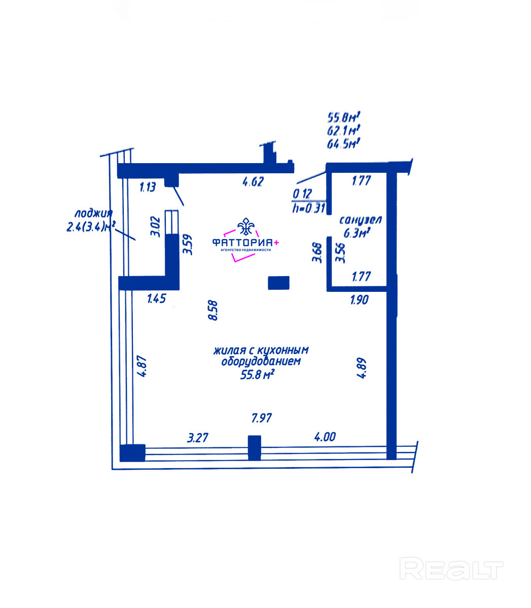 Общая площадь 62,1м2, по СНБ (с учетом лоджии) – 64,5м2.