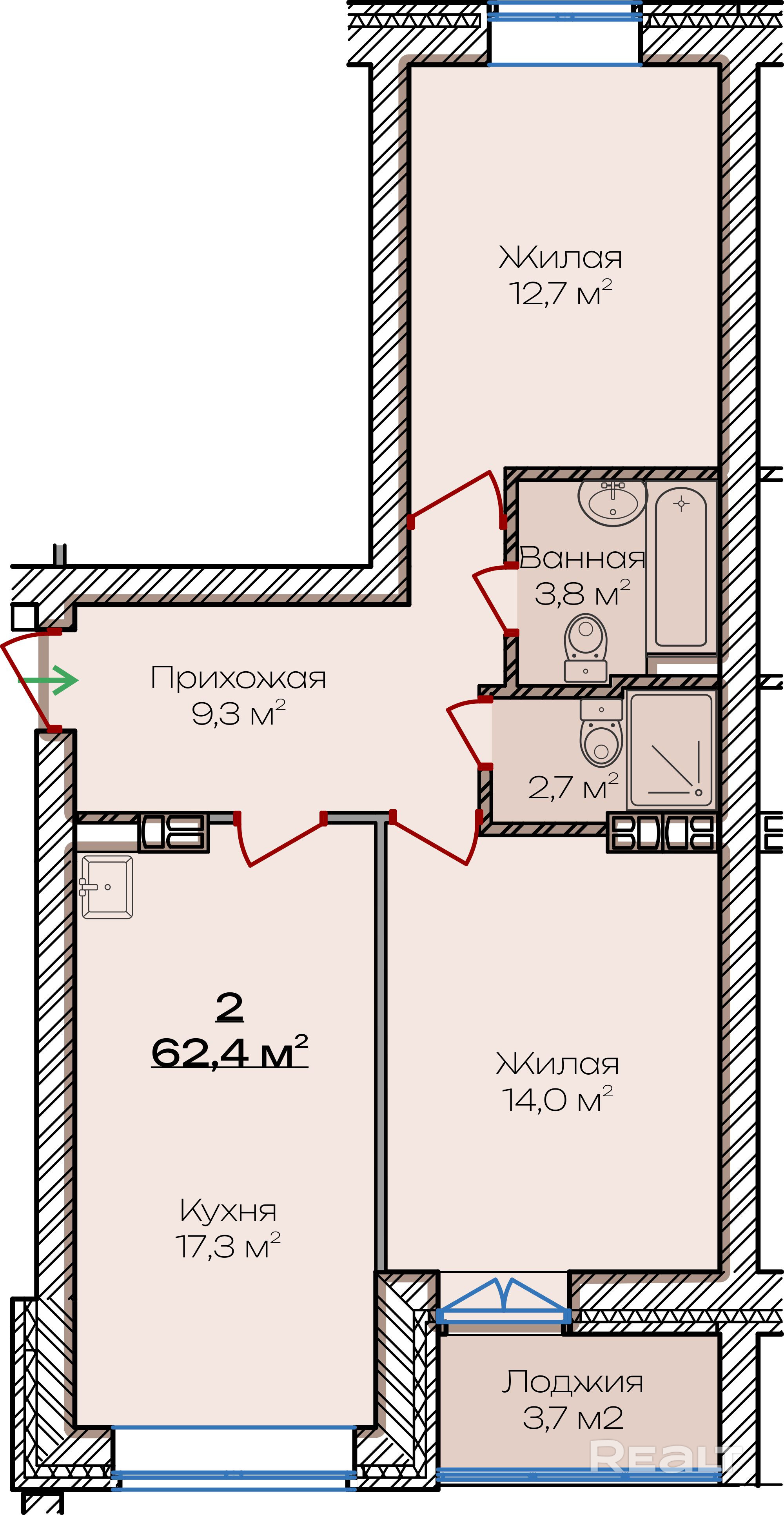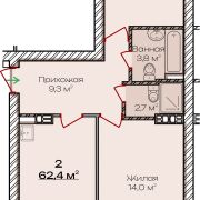 Площадь квартиры 62.4 м2, просторная кухня 17.3 м2.