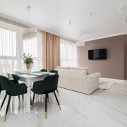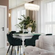 - Гостиная совмещена с кухней и представляет собой просторное, наполненное светом помещение с выходом на лоджию. Пол выполнен из итальянского керамогранита 120×60 с подогревом, стены отделаны норвежскими обоями и зеркальными вставками, потолок натяжной с парными люстрами "MauToni" и точечными светильниками "Novodvorski".
