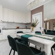 - Встроенная кухня выполнена с крашеными фасадами, установлены посудомоечная машина, измельчитель для мусора в раковине, фильтр для воды и бойлер. Вся мебель и техника остаются покупателю.