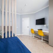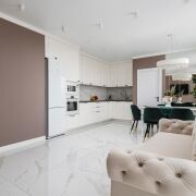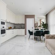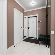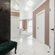 - Квартира спроектирована с учетом максимального удобства и гармонии пространства. Прихожая оформлена в светлых тонах: на полу - итальянская плитка формата 120×60, стены украшены зеркалами и декоративным керамогранитом, потолок натяжной. Здесь же находится вместительная гардеробная площадью 5 м2.