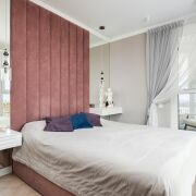 - Основная спальня также продумана до мелочей: паркетная доска на полу, норвежские обои и зеркала на стенах, натяжной потолок. Вся мебель, включая кровать и шкаф-купе с крашеными фасадами, изготовлена на заказ и остаётся новому владельцу.