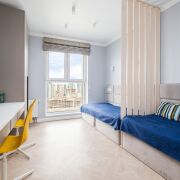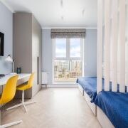 - Детская спальня оформлена в спокойных тонах: на полу паркетная доска, стены  - норвежские обои. Встроенная система хранения, перегородка из массива дерева, кровати-диваны выполнены под заказ. Светильники "Novodvorski" создают мягкое, уютное освещение. Вся мебель остается.