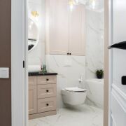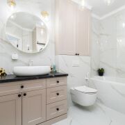 - Ванная комната оформлена в светлых тонах: на стенах и полу - крупноформатный итальянский керамогранит 120×60. Установлена акриловая ванна, смесители Roca, душевая система, биде, стиральная и сушильная машины, бойлер, электрический полотенцесушитель и тёплые полы. Мебель с крашеными фасадами, фурнитура премиум-класса.