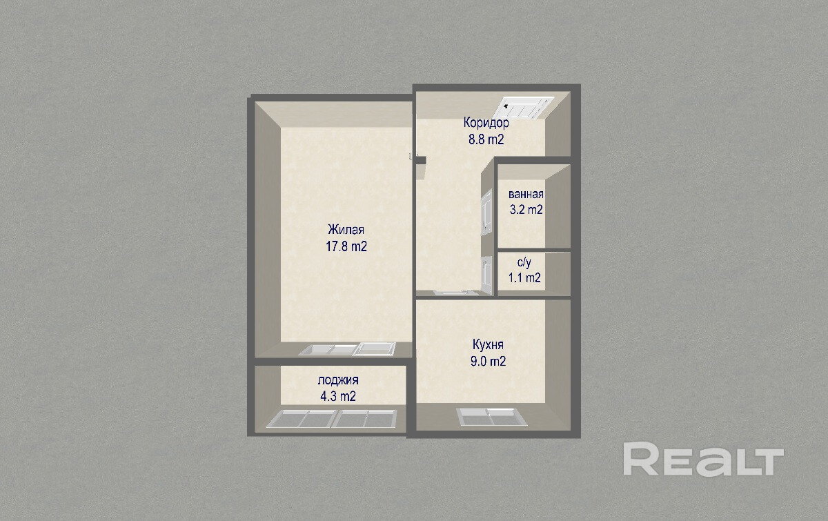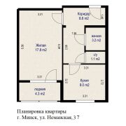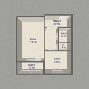 Общая площадь – 39,9 м2, жилая – 17,8 м2, кухня – 9 м2. Планировка удобная и понятная.