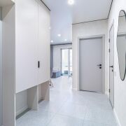 - Ремонт выполнен с акцентом на практичность. Натяжные потолки, керамогранит в кухне и коридоре на полу, в детской — ламинат. Шкафы уже установлены, есть отдельная гардеробная-постирочная, которая снимает вопрос хранения и бытовых процессов.