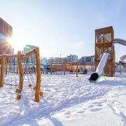- Закрытый двор без автомобилей - идеальное место для спокойных прогулок, детских игр и отдыха на свежем воздухе. Территория благоустроена в стиле "Горная Долина": веревочный городок, игровые детские площадки, спортивные площадки и зоны отдыха.