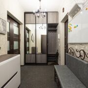 гостиная, которые не просматриваются из коридора и не перегружаются лишними межкомнатными дверями. Большая ванная комната совмещает одновременно душевую кабину и ванну. Вся мебель выполнена под заказ.