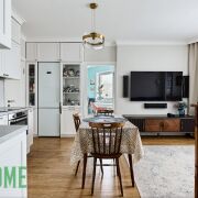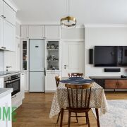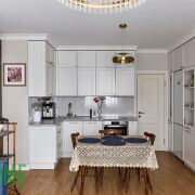 Встроенная кухня оборудована всем необходимым - бытовая техника известных производителей Bosch, Samsung, Electrolux: индукционная варочная панель, духовой шкаф с функцией СВЧ, посудомоечная машина, холодильник, вытяжка, установлена фильтрация воды.