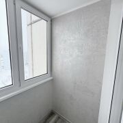 Лоджия застеклена такими же двойными стеклопакетами ПВХ как и в жилой комнате. А выход на неё осуществляются из кухни. На стенах лоджии нанесена венецианская штукатурка и затем окрашена в серый цвет. На полу линолеум.