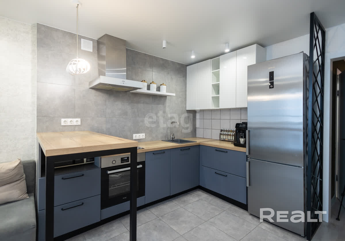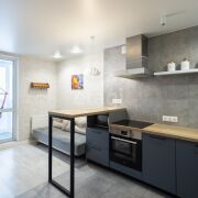 - Кухня полностью оборудована: холодильник, духовой шкаф, индукционная варочная поверхность, вытяжка, посудомоечная машина, удобные шкафы с качественной фурнитурой.