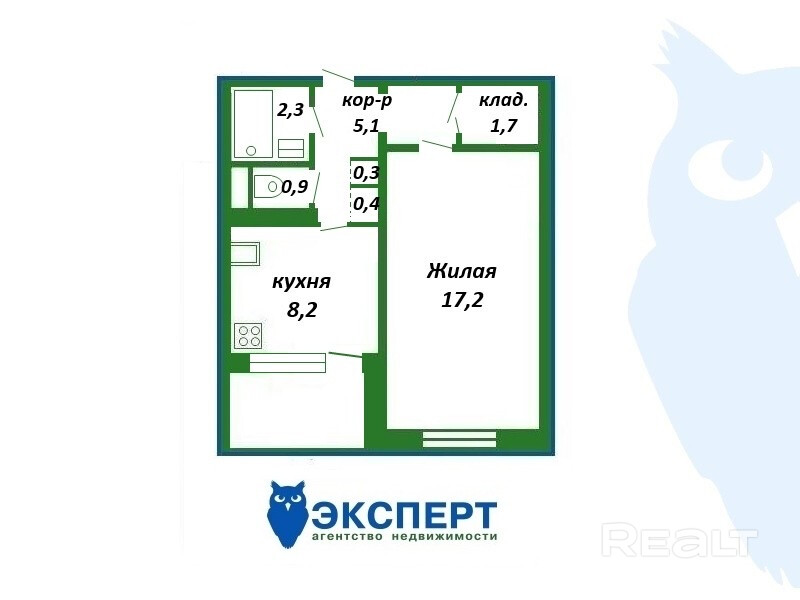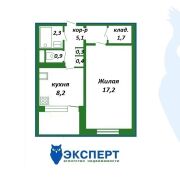 Общая площадь квартиры по СНБ - 37.8 м2. Комната - 17.2 м2.