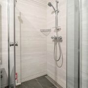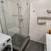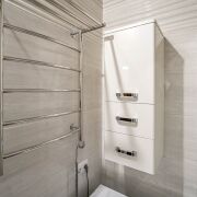В ванной комнате установлена  душевая кабина 1х1 м из закаленного стекла и размещены  два полотенцесушителя: дизайнерский водяной и дополнительный электрический.