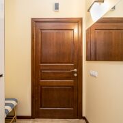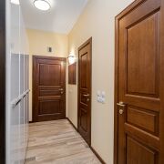 Все внутренние двери и плинтусы изготовлены из массива дуба благородного цвета «коньяк», создавая теплую и солидную атмосферу.