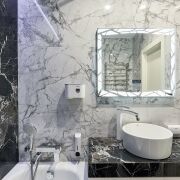 1 санузел: ванна 170*70 и умывальник Roca, стирально-сушильная машина Samsung, умное, интерактивное зеркало с подсветкой.