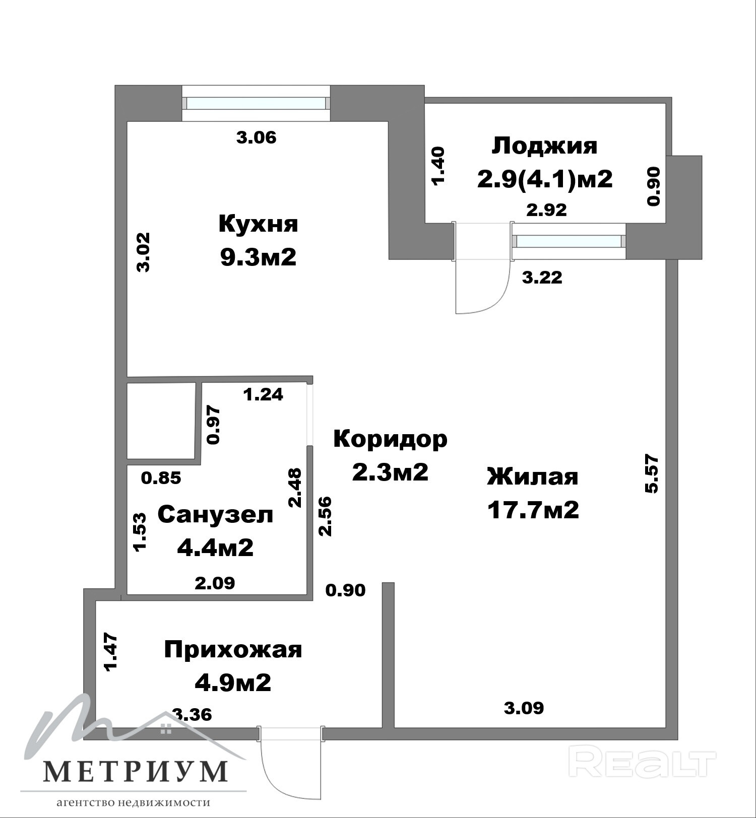 · Кухня 9,3 м2 — достаточно места для кухонного гарнитура и обеденной зоны.