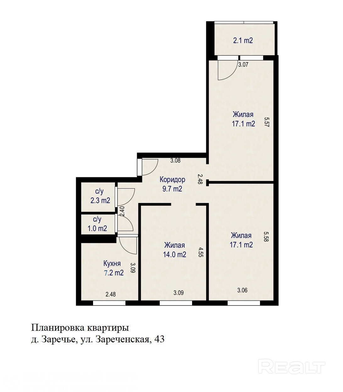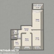 - Жилые раздельные комнаты: 17,1 кв.м., 17,1 кв.м., 14 кв.м.