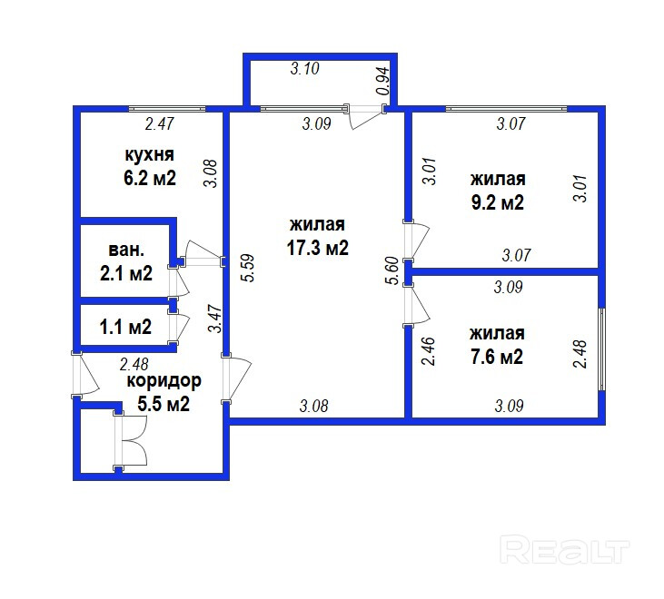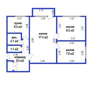 2 комнаты раздельные по 9 м 2 и 7.6 м2 и одна проходная 17.3 м2