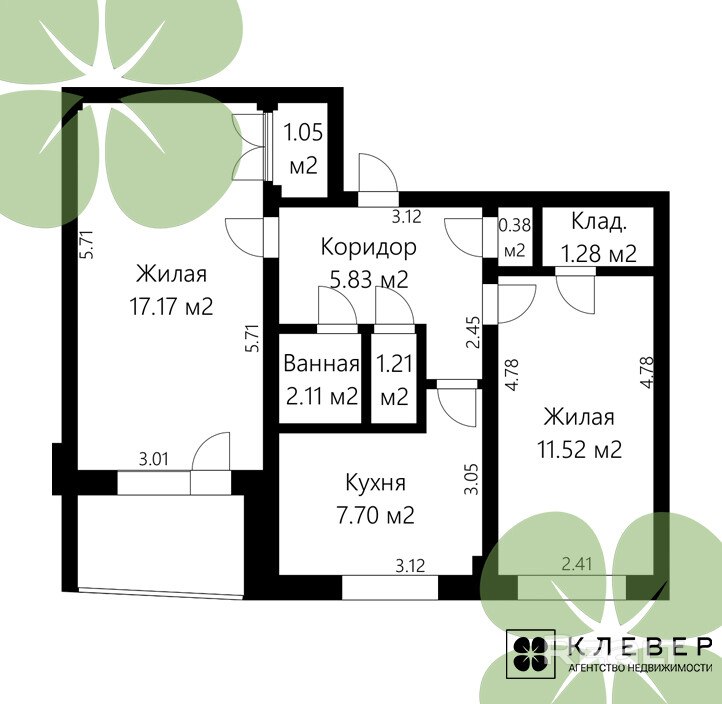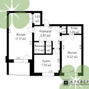 Шикарная планировка квартиры - два раздельные комнаты на разные стороны относительно кухни 17м2 и 11,5м2