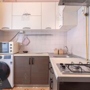 Кухонная зона: Компактная кухня площадью 6,2 м2 оптимальна для размещения необходимой бытовой техники и обеденной группы.